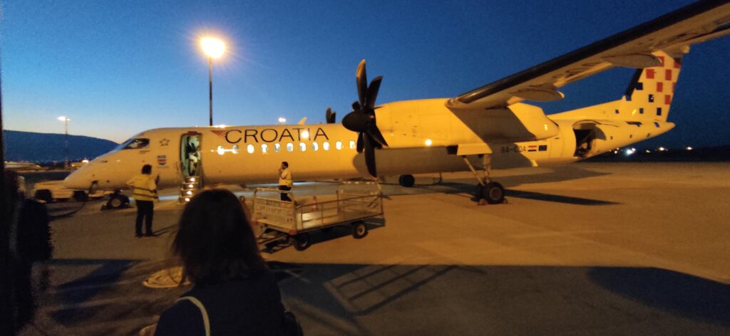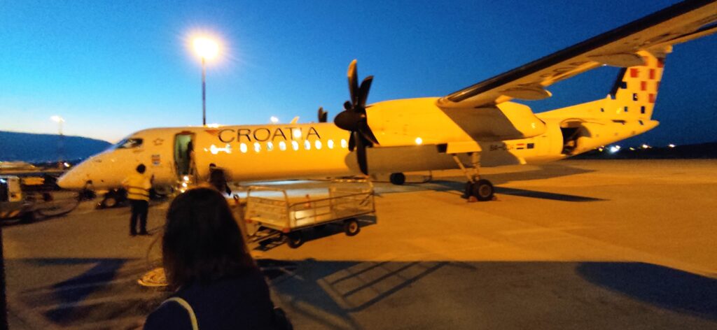 U petak na dan putovanja tata i ja uputili smo se sat vremena prije poletanja prema zračnoj luci dr. Franjo Tuđman. Kad smo došli nikoga još nije bilo tamo. Ja sam sjela na kavu na aerodromu. Kava je bila dobra, ali podosta skupa (20 kn) kao sve na aerodromu. Nakon par minuta činilo mi se da sam vidjela da je možda naša vodička došla. Uputila sam se nakon što sam popila kavu prema njoj, da provjerim da li je to ona, naš vodič Maja, i bila je to ona. Maja Stipčić je bila naš vodič. Zove se kao jedna od mojih kolegica na poslu koja je ovaj mjesec bila kod nas na zamijeni. Došla je ranije i čekala je na nas kod pulta za informacije. Upoznale smo se i rekla je da možemo ići već prema ulazu za avion. Bio je tamo još jedan par koji je s njom komentirao zašto moramo presjedati u Dubrovniku. Gospodin je odlučno rekao da ne moramo plaćati vatrogasce u avionu. Još dan danas nisam shvatila logiku njegovu i da li nas je zafrkavao.