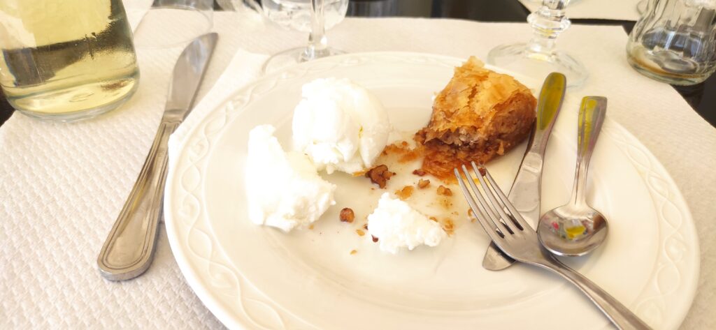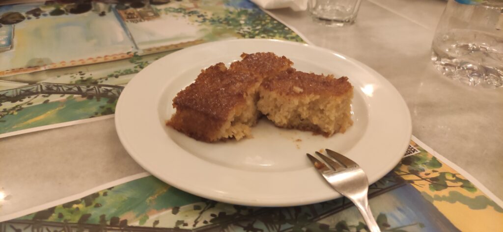 Restoran nas je počastio i desertom, kolačem natopljenim sirupom, koji je bio jako fin, ali naša vodička je rekla da ćemo mi to sve platiti, najvjerojatnije je mislila zbog karaktera Grka. Na kraju smo dobili račun koji je bio iskrižan malo jer se konobar zabunio pa nismo znali koliko moramo platiti. ( he he he). Mislima da je sve skupa 32 Eura koštalo.