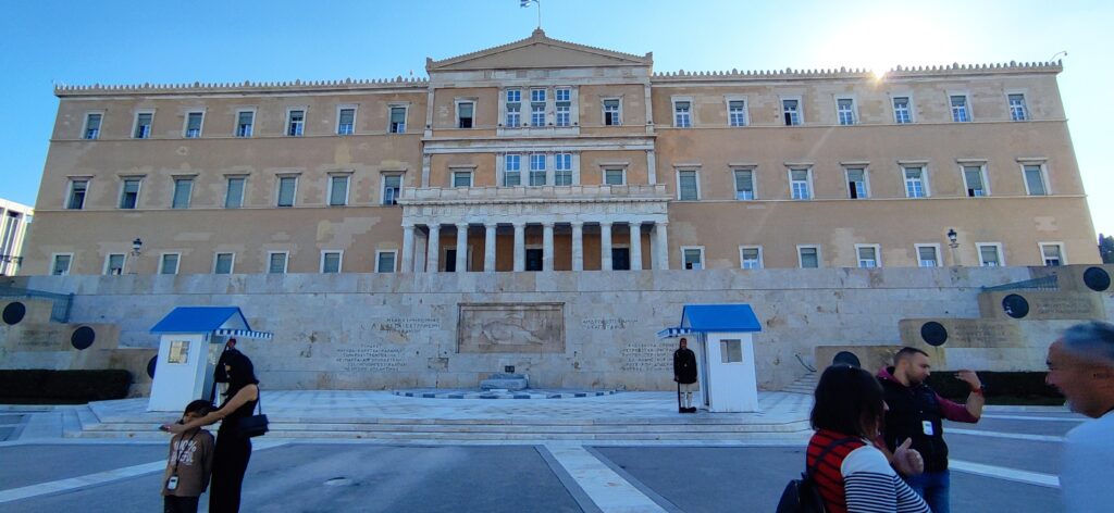 Nakon što smo napravili par slika ispred stadiona krenuli smo dalje s autobusom u istraživanje Atene. Sljedeća atrakcija do koje smo došli je bio Grčki parlament. (vidi sliku). Poznat je po spomeniku neznanom junaku s isklesanim rečenicama na starogrčkom i po svojoj straži Evzones s neobičnim odorama i velikim klompama. Evzoni bili su dio nekoliko povijesnih elitnih pješaka i dio planinske jedinice grčke vojske. Danas su članovi predsjedničke garde koji čuvaju grobnicu nepoznatog vojnika. Poznati su po svojoj uniformi koja je evaluirala iz odjeće kou su nosili klefti koji su se borili protiv osmanske okupacije Grčke. Najvidljiviji predmet ove uniforme je fustanella koji je sličan kiltu. Njihova prepoznatljiva haljina pretvorila ih je u popularnu sliku grčkog vojnika, posebno među strancima. Iako inače daju da se slikaš bliže s njima i parlamentom, nama taj dan nisu dopustili i morali smo se iz daljine s stražom slikati. Smještena je u Staroj kraljevskoj palači s pogledom na trg Syntagma u Ateni. On je jednodomni zakonodavni organ s 300 članova izabranih na četverogodišnji mandat. Izgrađena 1842. na tri etaže, a dizajnirao ju je Friedrich von Gartner. U studenom 1929. pretvorena je u grčki parlament.