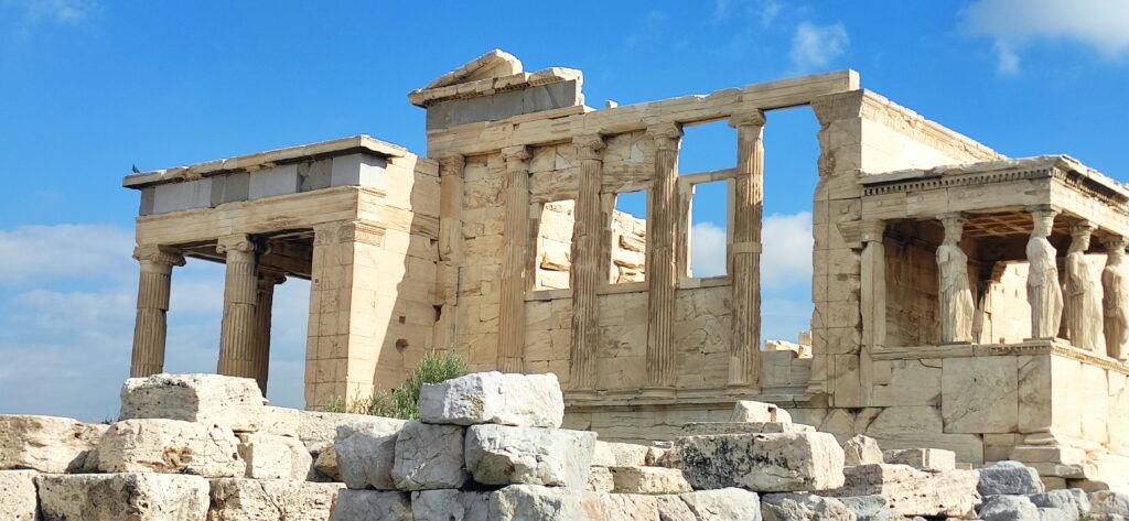 Kako bi nam što bolje prikazao povijest akropole naš vodič je imao slike. Bio je i pripremljen što se covid mjera tiče, imao je slušalice za sve, preko kojeg smo ga slušali što nam on priča. Iako kad čovjek razmišlja koliko se on treba spremati za vođenje neke grupe, kad čovjek pršti od znanja, bar se meni tako činilo. Slikama nam je objasnio najpoznatiji mit o Ateni koji je i dočaran u kipovima koji su bili nekada na Akropoli. Smatram da oni koji ne znaju puno o Ateni i povijesti i koji se nisu puno pripremali je potrebno ili nužno da imaju dobrog vodiča kao npr. našeg jer se putovanje bez svih tih priča ne isplati uplatiti jer te priče i mitovi samo dočaravaju vrijeme antike i život kakav je nekad bio i upotpunjuju doživljaj. Taj mit koji je nama preko slika objašnjavao naš vodič govori o borbi boga Posejdona i božice Atene nad prevlašću grada Atene. Smatra se da se ta bitka odvijala na akropoli. Posejdon je ponudio građanima kada je lupio svojim kopljem o tlo slanu vodu dok je božica Atena ponudila maslinu.