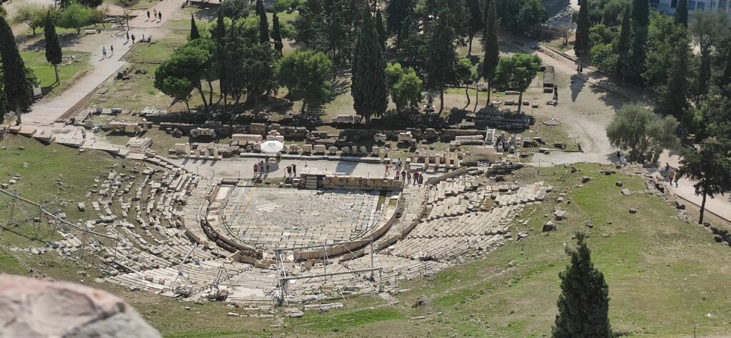 Dolje je Dionizijevo kazalište ili najstarije grčko kazalište. Ono je služilo kao protutip antičkim teatrima. Smješten je na jugoistočnom obronku atenske Akropole. Prvi uređaji potječu iz VI. i V. St pr. Kr. , a obnovio ga je atenski državnik Likurg u drugoj polovici IV. st.pr. Kr. Tada je u IV st. pr. Kr. podignuto amfiteatralno gledalište s kamenim sjedalima oko polukružne orchestre, na kojoj su nastupali glumci i zborovi. Orchestra je bio običan krug usred neke ravnice u kojoj se pjevalo i plesalo. Iza orchestre nalazila se kamena građevina ili pozornica u kojoj su se glumci pripremali za nastup. Gledatelji su stajali sa strane, a da bi bolje vidjeli uskoro su se počeli smještati po okolnim brežuljcima. Na tom mjestu su se počeli graditi i sjedala, u početku drvena, a kasnije kamena i tako je nastalo polukruglo gledalište ili theatron. Grčko kazalište je bilo jako cijenjeno. U dvoranama je bilo do 25.000 sjedala, a u Ateni čak 30.000 sjedala. Starogrčko kazalište je kazališna kultura koja je cvala od 550. do 220. pr.Kr. Atena je bila njegovo središte. Kazalište u Ateni je dio festivala Dionizija odnosno grčkog boga vina. Komedija, tragedija i satira su tri dramska žanra koja su nastala upravo u klasičnoj Ateni. Svečanosti su se iz Atene proširile u brojne grčke kolonije i gradove kako bi se promovirao zajednički kulturni identitet. Novovjekovno kazalište se temelji upravo na atenskoj drami koja je iznimino obilježila i svjetsku kulturu općenito