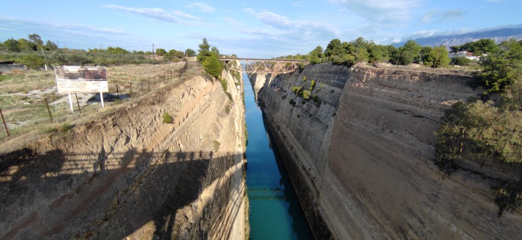 Prvo smo se uputili prema Korintskom kanalu. On se smatra velikim tehnološkim dostignućem svoga vremena. On spaja Korintski zaljev sa Sauronskim zaljevom u Egejskom moru. Prolazi kroz uski Korintski prolaz i razdvaja poluotok Peloponez od ostatka grčkog kopna, čineći ga tako otokom. Dug je 6,3 km, širok 21 metar. Građen je u periodu od 1881.-1893. Njime se putovanje za brodove skraćuje za 400 metara. Danas ga pretežno koriste turistički brodovi. Godišnje prođe oko 11.000 brodova. Na oba kraja kanala se nalaze pokretni mostovi za promet. Ovdje smo stali da bi se slikali s kanalom i popili kavu u obližnjem kafiću. Napravila sam dosta slika s ovim kanalom. Lijep je kanal i ta njegova modro zelena boja.