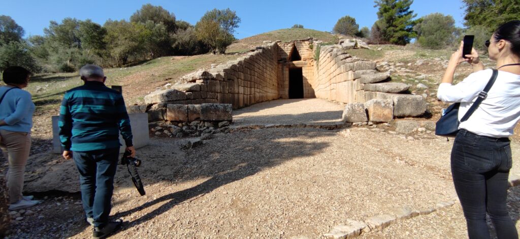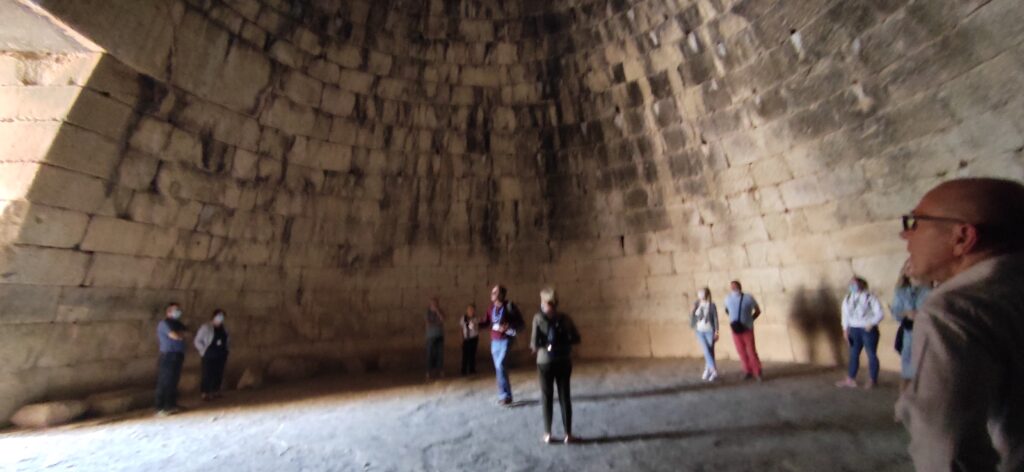 grada. Unutra je pronađeno 16 tijela ljudi po priči našeg vodiča iako se smatra da je to Agamenonova grobnica. Drugi grob je iskopao grčki arheološki servis izvan zidova tvrđave 1951. Oba kruga datiraju iz 16 st. pr. kr. i otkrivaju zapanjujuće bogatsvo. U klasično i predhelensko vrijeme u Grčkoj tolos je bio u funkciji hrama ili herona i javlja se vrlo rijetko: u Delfima, Epidauru, Olimpji i Samotraki, a javlja se i u Rimskoj arhitekturi (hram Rome i Auguste u Ateni, Vestin hram i Panteon u Rimu). U 14 st. pr. kr. Mikena je u svom cvatu i dostigla je svoj vrhunac. U to su vrijeme sagrađene najveće kraljevske grobnice-tolosi kao što je tzv. Atrejeva riznica. Ona je jedan od najljepših i najdojmljiviji spomenik te vrste i tog vremena i to na području kontinentalne i otočne Grčke. Stariji krug B sadrži gotovo 26 grobova u obliku rova, najstariji su siromašno opremljeni, ali bogatstvo grobova povećava se tijekom razdoblja korištenja. Krug A osigurao je mjesto za 6 masivnih grobova u obliku rova i ukupno je sadržavao 19 grobnica ili 16 kako što je rekao naš vodič. Dva kasnija groba iz kruga B i svi grobovi kruga A poznati su po masivnim izrezbarenim nadgrobnim pločama. Grobovi kruga A ističu se po tome jer je u njima veće bogatstvo pohranjenih grobnih darova od onih u grobovima kruga B. To dokazuje da je u njima bila pohranjena kraljevska obitelj. Grobovi muškaraca bili su opremljeni bogatim svečanim oružjem s mnogo bodeža ukrašenih prizorima krajolika i lova. Žene su ukrašavane zlatni nakitom poput dijadema, koluta sašivenih na mrtvačkim pokrovima i brončanih broševa s gornjim dijelovima od dijamanta i kristala. Ogrlice od jantara uvezene iz Sjeverne Europe dokaz su razvijene trgovačke razmjene na velikim udaljenostima u to vrijeme. U svim grobovima je bilo keramičkih posuda dok je najbogatiji grob imao vaze prekrivene zlatom i srebrom uključujući posude za zdravice u čast Bogova koje su korištene prilikom pogrebnih svečanosti. Najznačajniji je pronalazak maske za lice prekrivene zlatom u krugu A. Pronađeno je ukupno 5 maski koje stilizirano pokazuju lice pokojnika. Osnovni model posmrtne maske je pronađen u jednom od kasnijih grobova kruga B.