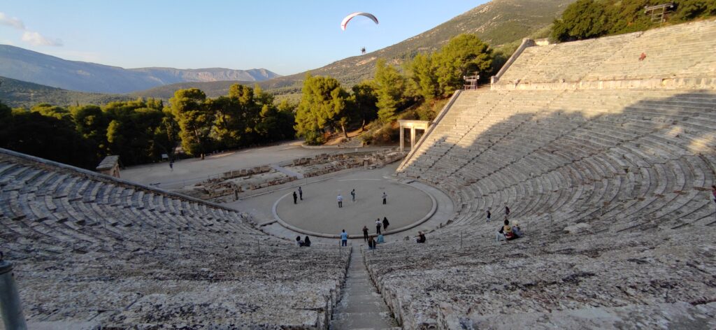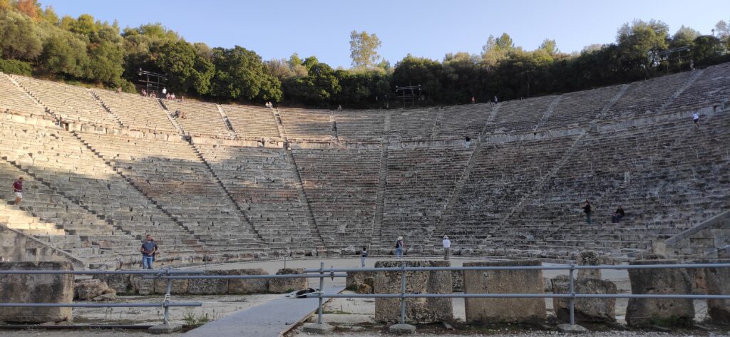 Nakon Asklepijevog muzeja otišli smo do Dionizijevog kazališta u Epidaurusu koje poznato po tome što ima jako dobru akustiku. Kada je naš vodič pljeskao u sredini kazališta to se je dobro čulo po cijelom kazalištu. To kazalište je najveće kazalište u Grčkoj, promjera 114 m koje je moglo primiti 12.000 gledatelja. Kao dio Asklepijeva svetišta od 1988. je na UNESCOVOM popisu svjetske baštine. Sagrađeno je u 4 st. Pr. Kr. od strane Polikleitosa mlađeg. Zbog svoje akustičnosti, drveno se kazalište i danas koristi i to u okviru godišnjeg festivala Epidaura. Akustika kazališta je doista sjajna, gledatelji u stražnji redovima poznati su da čuju komičare na pozornici bez pojačanja.