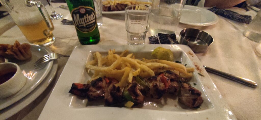 Tamo sam konačno probala njihov specijalitet souvlaki koji mi je bio jako fin. Probala sam tamo i Grčko pivo iako ja ne pijem baš. Meni je bila jako ljepo tamo jer smo svi zajedno bili za stolom i svi skupa pričali i zabavljali se. S nama je za stolom su opet bili onaj gospodin i gospođa koji su i prije sjedili s nama. Taj gospodin je bio najvesliji za tim stolom i častio je vinom. U tom restoranu je svirala tipični grčki bend s tipičnom grčkom muzikom. Oni nisu imali nikakvu pauzu, a nama ta vrsta glazbe nije poznata i bila mi je malo pomalo smiješna kada nisi na nju naviknut. Nakon večere svi smo otišli u hotel na spavanac.